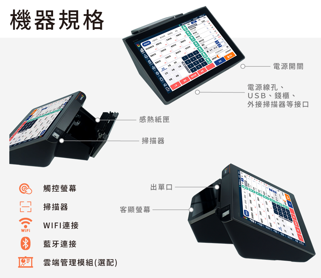 平板式|觸控式螢幕|二聯式發票|三聯式發票|電子發票收銀機|收據機|可外接錢櫃出單機掃描器貼紙機|內建出單機|POS系統
